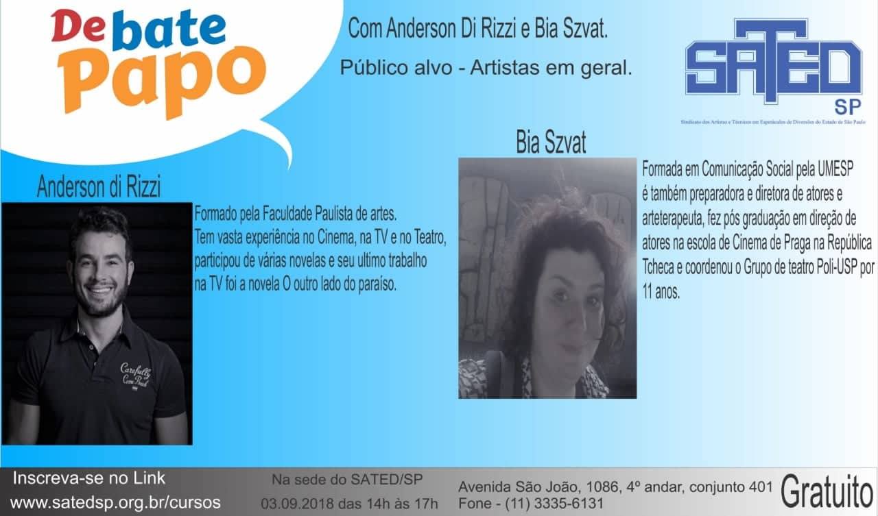 O Debate Papo acontece no dia 03/09/2018 das 14:00h as 17:00h na sede do Sated-SP e tem como público alvo artistas da cena teatral.