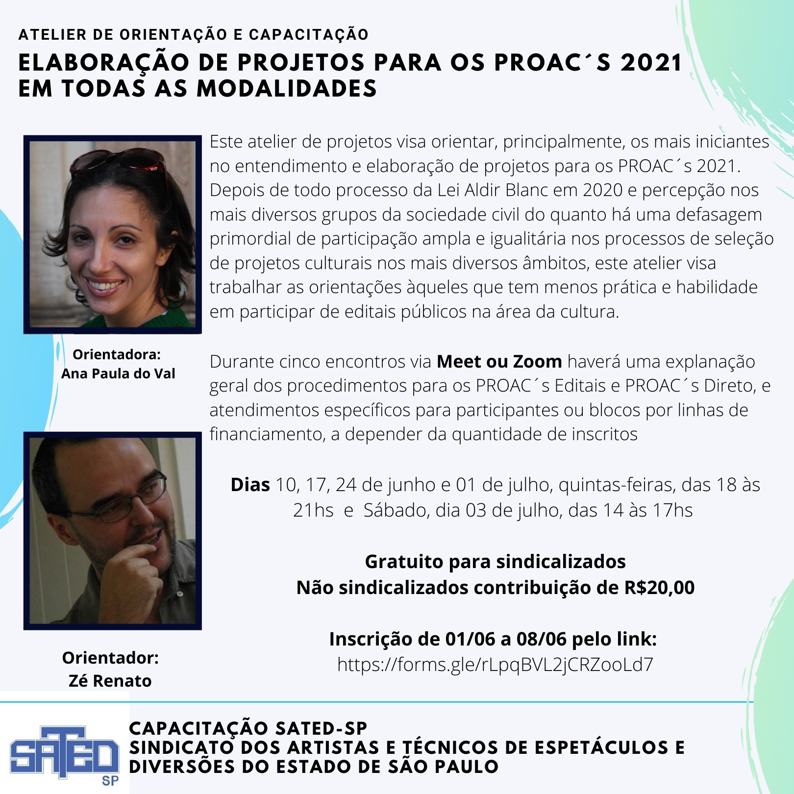 Com orientação de Ana Paula do Val e Zé Renato o atelier de projetos visa orientar, principalmente, os mais iniciantes no entendimento e elaboração de projetos para os PROAC´s 2021. Depois de todo processo da Lei Aldir Blanc em 2020 e percepção nos mais diversos grupos da sociedade civil do quanto há uma defasagem primordial de participação ampla e igualitária nos processos de seleção de projetos culturais nos mais diversos âmbitos, este atelier visa trabalhar as orientações àqueles que tem menos prática e habilidade em participar de editais públicos na área da cultura.
