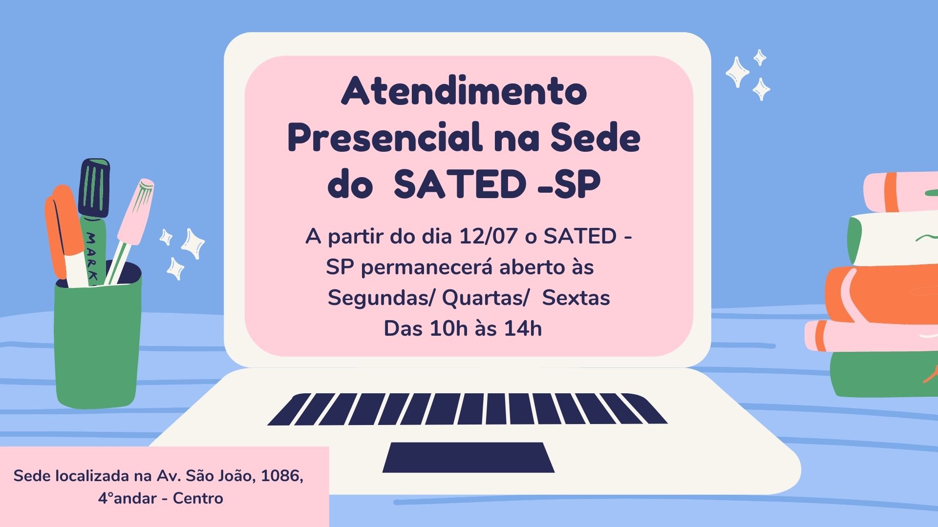 A partir do dia 12/07 o SATED-SP abrirá a sede localizada na Av. São João, 1086 – 4º andar. A abertura será feita todas as segundas/ quartas/ sextas das 10h as 14h.