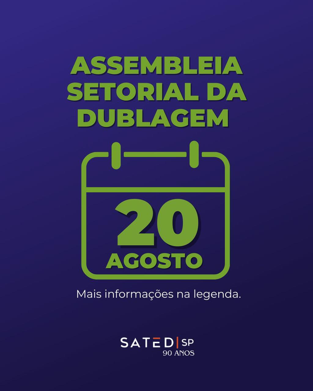 Convocamos toda a categoria que atua em dublagem para participarem da Assembleia Setorial da Dublagem, que acontecerá no dia 20 de agosto de 2025, em formato online através da plataforma digital Zoom. Iniciaremos às 19h em primeira convocação e às 19h15 em segunda convocação.