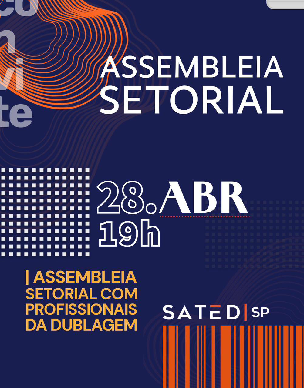 SINDICATO DOS ARTISTAS E TÉCNICOS EM ESPETÁCULOS DE DIVERSÕES DO ESTADO DE SÃO PAULO – SATED/SP, CNPJ 62.494.174/0001-05, com endereço na Av. São João, 1086, cj. 401/402, Centro, em São Paulo – Capital, por seu Presidente Rudifran de Almeida Pompeu, nos termos do estatuto em vigor, convoca todos os profissionais da área da Dublagem, sócios e não sócios em pleno gozo de seus direitos para participarem da Assembleia Geral Extraordinária que será realizada no dia 28 de abril de 2026 às 19h00 em primeira convocação e às 19h15 em segunda convocação, a realizar-se em formato on-line por meio da plataforma ZOOM, mediante cadastramento prévio e envio do link de acesso po meio do preenchimento de formulário disponibilizado no site oficial do sindicato (https://satedsp.org.br) e em suas redes sociais https://www.instagram.com/satedspoficial), para discussão e deliberação das seguintesordens do dia: 1) Elaboração de pauta reivindicatória; 2) Estudos de critérios para dublagem de novelas verticais; 3) Inadimplência de cachês por estúdios de dublagem; 4) Outros assuntos de interesse da categoria.