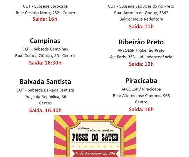 SINDICATO DOS ARTISTAS E TÉCNICOS EM ESPETÁCULOS DE DIVERSÕES NO ESTADO DE SÃO PAULO - SATED/SP, pelo presente, de acordo com o Estatuto Social da Entidade, convoca todos os trabalhadores Artistas em DUBLAGEM, associados ou não, a comparecerem à Assembleia Geral Permanente, a ser realizada na FUNARTE/SP , sito à Alameda Nothmann, 1058 - Campos…