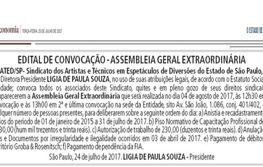 Comunicamos todos os Artistas e Técnicos de Diversões do Estado de São Paulo, conforme aprovado em assembleia em 04 de agosto de 2017 o valor da taxa para obtenção do Registro Profissional – DRT foi fixado em R$ 600,00 reais. Atenciosamente Diretoria