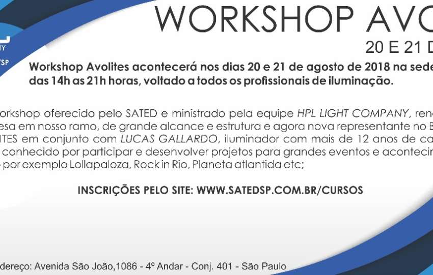 A palestra acontece na sede do Sated-SP no dia 26/11/2018, das 14:00 as 18:00 e tem como público alvo todos os profissionais da iluminação, sonorização, video projeção, cenotécnicos, cenógrafos e interessados em geral.A palestra é gratuita e com número de vagas limitadas, garanta…